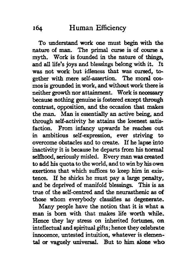 To understand work one must begin with the nature of man. The primal curse is of course a myth. Work is founded in the nature of things, and all life's joys and blessings belong with it. It was not work but idleness that was cursed, together with mere self-assertion. The moral cosmos is grounded in work, and without work there is neither growth nor attainment. Work is necessary because nothing genuine is fostered except through contrast, opposition, and the occasion that makes the man. Man is essentially an active being, and through self -activity he attains the keenest satisfaction. From infancy upwards he reaches out in ambitious self-expression, ever striving to overcome obstacles and to create. If he lapse into inactivity it is because he departs from his normal selfhood, seriously misled. Every man was created to add his quota to the world, and to win by his own exertions that which suffices to keep him in existence. If he shirks he must pay a large penalty, and be deprived of manifold blessings. This is as true of the self-centred and the neurasthenic as of those whom everybody classifies as degenerate.