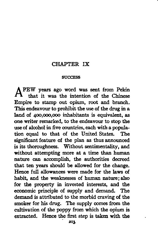 A FEW years ago word was sent from Pekin that it was the intention of the Chinese Empire to stamp out opium, root and branch. This endeavour to prohibit the use of the drug in a land of 400,000,000 inhabitants is equivalent, as one writer remarked, to the endeavour to stop the use of alcohol in five countries, each with a population equal to that of the United States. The significant feature of the plan as thus announced is its thoroughness. Without sentimentality, and without attempting more at a time than human nature can accomplish, the authorities decreed that ten years should be allowed for the change. Hence full allowances were made for the laws of habit, and the weaknesses of human nature; also for the property in invested interests, and the economic principle of supply and demand. The demand is attributed to the morbid craving of the smoker for his drug. The supply comes from the cultivation of the poppy from which the opium is extracted. Hence the first step is taken with the