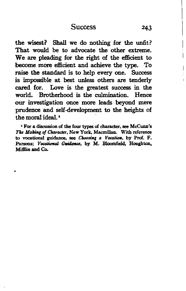 the wisest? Shall we do nothing for the unfit? That would be to advocate the other extreme. We are pleading for the right of the efficient to become more efficient and achieve the type. To raise the standard is to help every one. Success is impossible at best unless others are tenderly cared for. Love is the greatest success in the world. Brotherhood is the culmination. Hence our investigation once more leads beyond mere prudence and self -development to the heights of the moral ideal. *