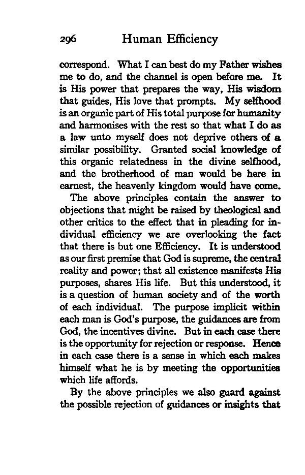 The above principles contain the answer to objections that might be raised by theological and other' critics to the effect that in pleading for individual efficiency we are overlooking the fact that there is but one Efficiency. It is understood as our first premise that God is supreme, the central reality and power; that all existence manifests His purposes, shares His life. But this understood, it is a question of human society and of the worth of each individual. The purpose implicit within each man is God's purpose, the guidances are from God, the incentives divine. But in each case there is the opportunity for rejection or response. Hence in each case there is a sense in which each makes himself what he is by meeting the opportunities which life affords.