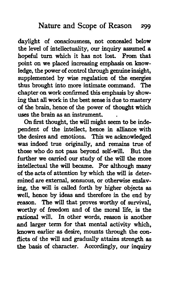 On first thought, the will might seem to be independent of the intellect, hence in alliance with the desires and emotions. This we acknowledged was indeed true originally, and remains true of those who do not pass beyond self-will. But the further we carried our study of the will the more intellectual the will became. For although many of the acts of attention by which the will is determined are external, sensuous, or otherwise enslaving, the will is called forth by higher objects as well, hence by ideas and therefore in the end by reason. The will that proves worthy of survival, worthy of freedom and of the moral life, is the rational will. In other words, reason is another and larger term for that mental activity which, known earlier as desire, mounts through the conflicts of the will and gradually attains strength as the basis of character. Accordingly, our inquiry
