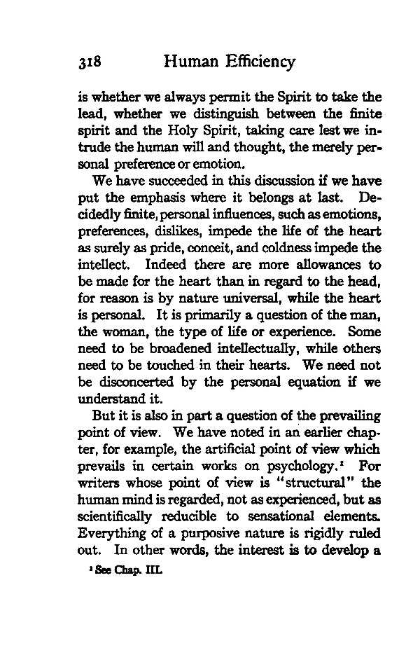 But it is also in part a question of the prevailing point of view. We have noted in an earlier chapter, for example, the artificial point of view which prevails in certain works on psychology. 1 For writers whose point of view is "structural" the human mind is regarded, not as experienced, but as scientifically reducible to sensational elements. Everything of a purposive nature is rigidly ruled out. In other words, the interest is to develop a