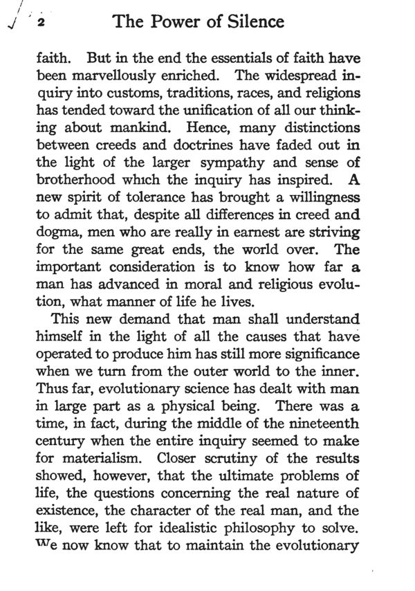 faith. But in the end the essentials of faith have been marvelously enriched. The widespread inquiry into customs, traditions, races, and religions has tended toward the unification of all our thinking about mankind. Hence, many distinctions between creeds and doctrines have faded out in the light of the larger sympathy and sense of brotherhood which the inquiry has inspired. A new spirit of tolerance has brought a willingness to admit that, despite all differences in creed and dogma, men who are really in earnest are striving for the same great ends, the world over. The important consideration is to know how far a man has advanced in moral and religious evolution, what manner of life he lives.