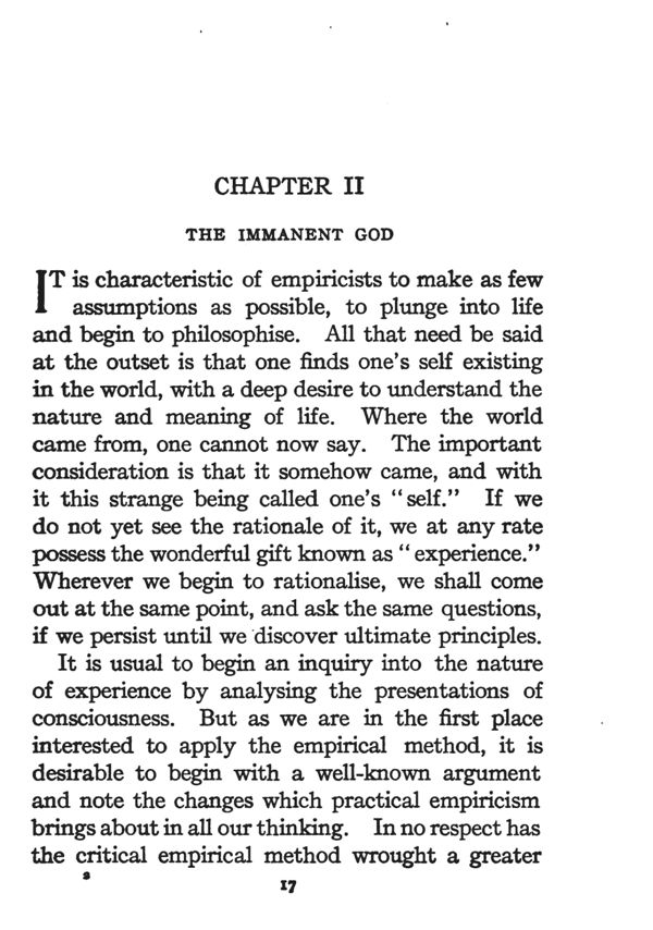 IT is characteristic of empiricists to make as few assumptions as possible, to plunge into life and begin to philosophise. All that need be said at the outset is that one finds one's self existing in the world, with a deep desire to understand the nature and meaning of life. Where the world came from, one cannot now say. The important consideration is that it somehow came, and with it this strange being called one's "self." If we do not yet see the rationale of it, we at any rate possess the wonderful gift known as "experience."