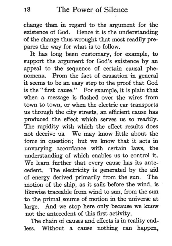 It has long been customary, for example, to support the argument for God's existence by an appeal to the sequence of certain causal phenomena. From the fact of causation in general it seems to be an easy step to the proof that God is the "first cause." For example, it is plain that when a message is flashed over the wires from town to town, or when the electric car transports us through the city streets, an efficient cause has produced the effect which serves us so readily. The rapidity with which the effect results does not deceive us. We may know little about the force in question; but we know that it acts in unvarying accordance with certain laws, the understanding of which enables us to control it. We learn further that every cause has its antecedent. The electricity is generated by the aid of energy derived primarily from the sun. The motion of the ship, as it sails before the wind, is likewise traceable from wind to sun, from the sun to the primal source of motion in the universe at large. And we stop here only because we know not the antecedent of this first activity.