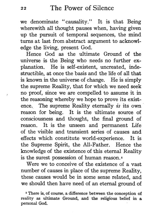 we denominate "causality." It is that Being wherewith all thought pauses when, having given up the pursuit of temporal sequences, the mind turns at last from abstract argument to acknowledge the living, present God.