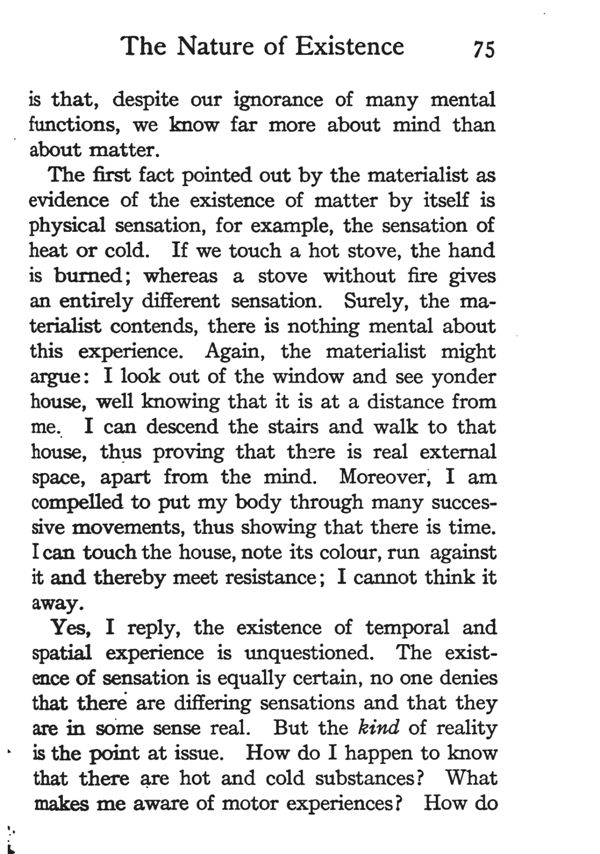 The first fact pointed out by the materialist as evidence of the existence of matter by itself is physical sensation, for example, the sensation of heat or cold. If we touch a hot stove, the hand is burned; whereas a stove without fire gives an entirely different sensation. Surely, the materialist contends, there is nothing mental about this experience. Again, the materialist might argue: I look out of the window and see yonder house, well knowing that it is at a distance from me. I can descend the stairs and walk to that house, thus proving that there is real external space, apart from the mind. Moreover, I am compelled to put my body through many successive movements, thus showing that there is time. I can touch the house, note its colour, run against it and thereby meet resistance; I cannot think it away.