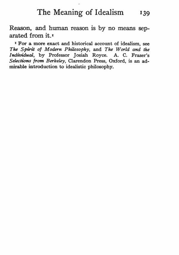 *For a more exact and historical account of idealism, see "The Spirit of Modern Philosophy," and "The World and the Individual," by Professor Josiah Royce. A. C. Fraser's "Selections from Berkeley," Clarendon Press, Oxford, is an admirable introduction to idealistic philosophy.