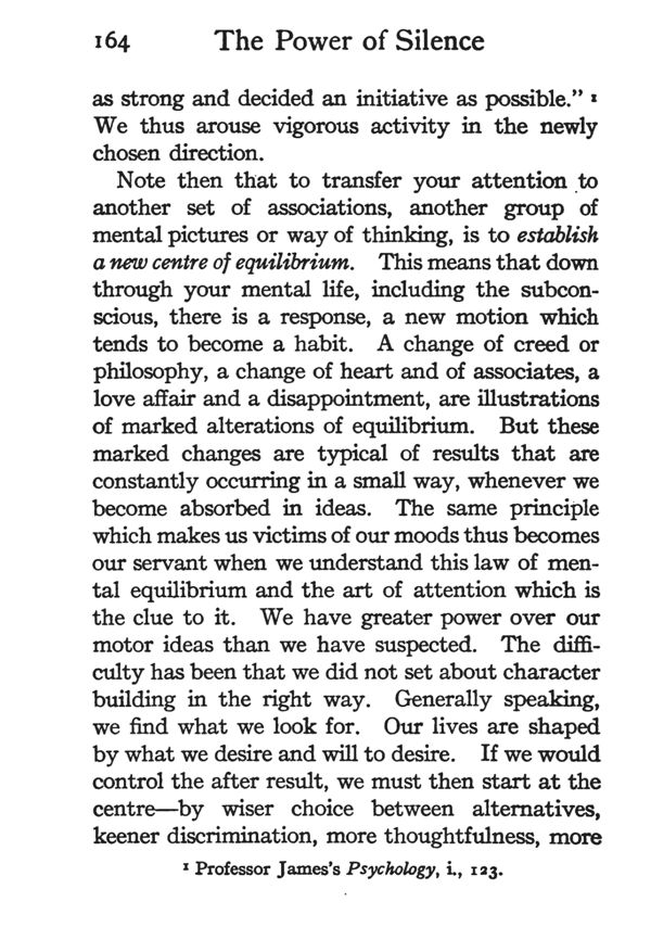 Note then that to transfer your attention to another set of associations, another group of mental pictures or way of thinking, is to establish a new centre of equilibrium. This means that down through your mental life, including the subconscious, there is a response, a new motion which tends to become a habit. A change of creed or philosophy, a change of heart and of associates, a love affair and a disappointment, are illustrations of marked alterations of equilibrium. But these marked changes are typical of results that are constantly occurring in a small way, whenever we become absorbed in ideas. The same principle which makes us victims of our moods thus becomes our servant when we understand this law of mental equilibrium and the art of attention which is the clue to it. We have greater power over our motor ideas than we have suspected. The difficulty has been that we did not set about character building in the right way. Generally speaking, we find what we look for. Our lives are shaped by what we desire and will to desire. If we would control the after result, we must then start at the centre--by wiser choice between alternatives, keener discrimination, more thoughtfulness, more
