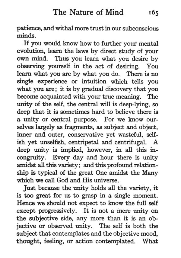 If you would know how to further your mental evolution, learn the laws by direct study of your own mind. Thus you learn what you desire by observing yourself in the act of desiring. You learn what you are by what you do. There is no single experience or intuition which tells you what you are; it is by gradual discovery that you become acquainted with your true meaning. The unity of the self, the central will is deep-lying, so deep that it is sometimes hard to believe there is a unity or central purpose. For we know ourselves largely as fragments, as subject and object, inner and outer, conservative yet wasteful, selfish yet unselfish, centripetal and centrifugal. A deep unity is implied, however, in all this in congruity. Every day and hour there is unity amidst all this variety; and this profound relationship is typical of the great One amidst the Many which we call God and His universe.