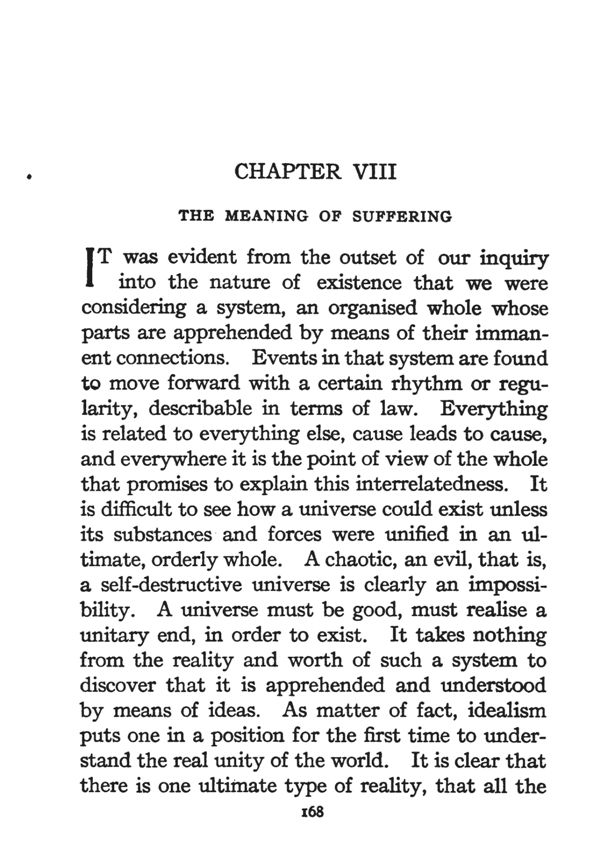 IT was evident from the outset of our inquiry into the nature of existence that we were considering a system, an organised whole whose parts are apprehended by means of their immanent connections. Events in that system are found to move forward with a certain rhythm or regularity, describable in terms of law. Everything is related to everything else, cause leads to cause, and everywhere it is the point of view of the whole that promises to explain this inter-relatedness. It is difficult to see how a universe could exist unless its substances and forces were unified in an ultimate, orderly whole. A chaotic, an evil, that is, a self-destructive universe is clearly an impossibility. A universe must be good, must realise a unitary end, in order to exist. It takes nothing from the reality and worth of such a system to discover that it is apprehended and understood by means of ideas. As matter of fact, idealism puts one in a position for the first time to understand the real unity of the world. It is clear that there is one ultimate type of reality, that all the