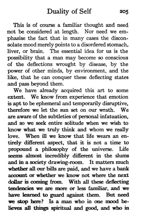 This is of course a familiar thought and need not be considered at length. Nor need we emphasise the fact that in many cases the disconsolate mood merely points to a disordered stomach, liver, or brain. The essential idea for us is the possibility that a man may become so conscious of the deflections wrought by disease, by the power of other minds, by environment, and the like, that he can conquer these deflecting states and pass beyond them.
