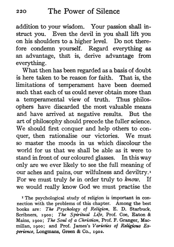 What then has been regarded as a basis of doubt is here taken to be reason for faith. That is, the limitations of temperament have been deemed such that each of us could never obtain more than a temperamental view of truth. Thus philosophers have discarded the most valuable means and have arrived at negative results. But the art of philosophy should precede the fuller science. We should first conquer and help others to conquer, then rationalise our victories. We must so master the moods in us which discolour the world for us that we shall be able as it were to stand in front of our coloured glasses. In this way only are we ever likely to see the full meaning of our aches and pains, our wilfulness and deviltry.* For we must truly be in order truly to know. If we would really know God we must practise the