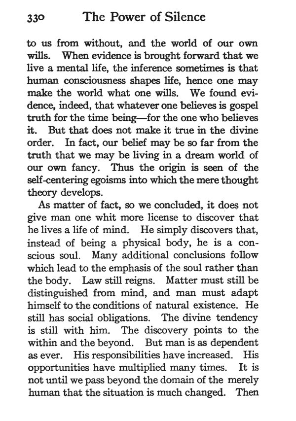 Preface to the New Edition - The Point of View - Immanent God - World of Manifestation - Nature of Existence - Mental Life - Meaning of Idealism - Nature of Mind - Meaning of Suffering - Duality of Self - Adjustment - Poise - Self-Help - Entering the Silence - The Outlook - Contents - Index