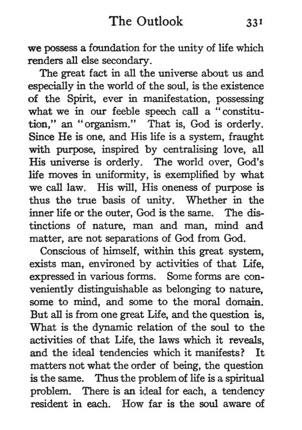 Preface to the New Edition - The Point of View - Immanent God - World of Manifestation - Nature of Existence - Mental Life - Meaning of Idealism - Nature of Mind - Meaning of Suffering - Duality of Self - Adjustment - Poise - Self-Help - Entering the Silence - The Outlook - Contents - Index