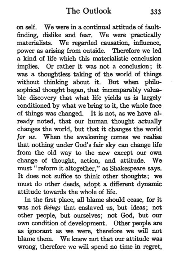 on self. We were in a continual attitude of fault- finding, dislike and fear. We were practically materialists. We regarded causation, influence, power as arising from outside. Therefore we led a kind of life which this materialistic conclusion implies. Or rather it was not a conclusion; it was a thoughtless taking of the world of things without thinking about it. But when philosophical thought began, that incomparably valuable discovery that what life yields us is largely conditioned by what we bring to it, the whole face of things was changed. It is not, as we have already noted, that our human thought actually changes the world, but that it changes the world for us. When the awakening comes we realise that nothing under God's fair sky can change life from the old way to the new except our own change of thought, action, and attitude. We must "reform it altogether,'' as Shakespeare says. It does not suffice to think other thoughts; we must do other deeds, adopt a different dynamic attitude towards the whole of life.
