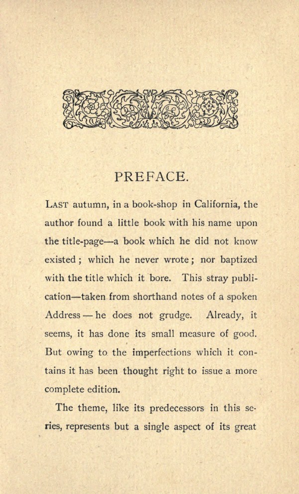 Last autumn, in a book-shop in California, the author found a little book with his name upon the title-page --- a book which he did not know existed; which he never wrote; nor baptized with the title which it bore. This stray publication --- taken from shorthand notes of a spoken Address --- he does not grudge. Already, it seems, it has done its small measure of good. But owing to the imperfections which it contains it has been thought right to issue a more complete edition.