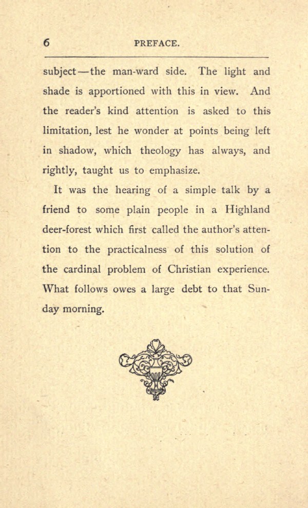 It was the hearing of a simple talk by a friend to some plain people in a Highland deer-forest which first called the author's attention to the practicalness of this solution of the cardinal problem of Christian experience. What follows owes a large debt to that Sunday morning.