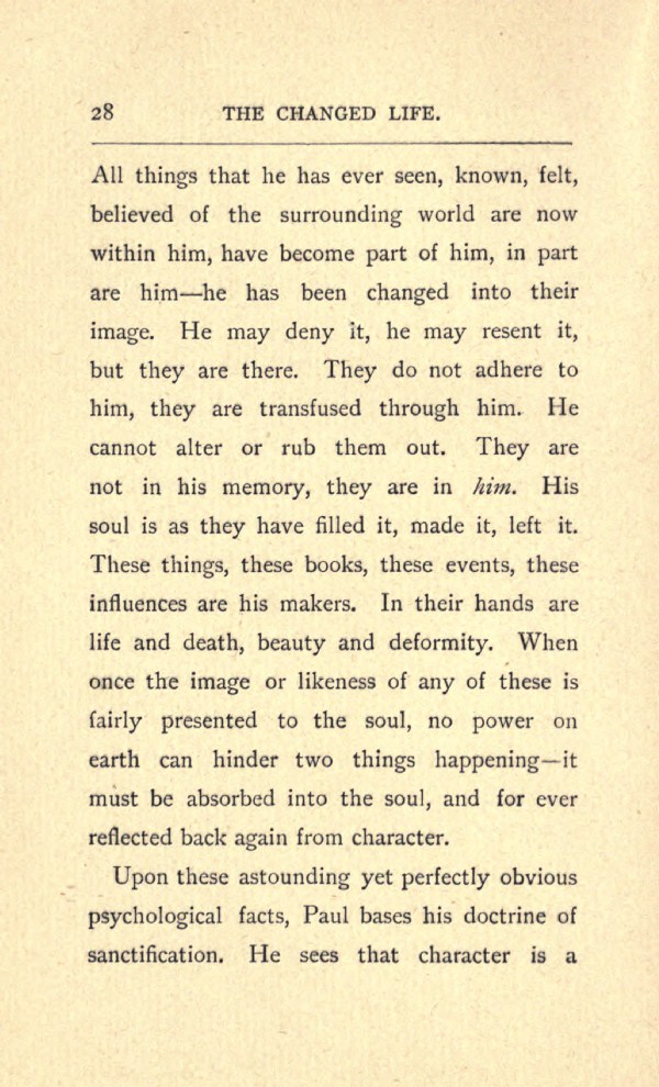 All things that he has ever seen, known, felt, believed of the surrounding world are now within him, have become part of him, in part are him --- he has been changed into their image. He may deny it, he may resent it, but they are there. They do not adhere to him, they are transfused through him. He cannot alter or rub them out. They are not in his memory, they are in him. His soul is as they have filled it, made it, left it. These things, these books, these events, these influences are his makers. In their hands are life and death, beauty and deformity. When once the image or likeness of any of these is fairly presented to the soul, no power on earth can hinder two things happening --- it must be absorbed into the soul, and for ever reflected back again from character.