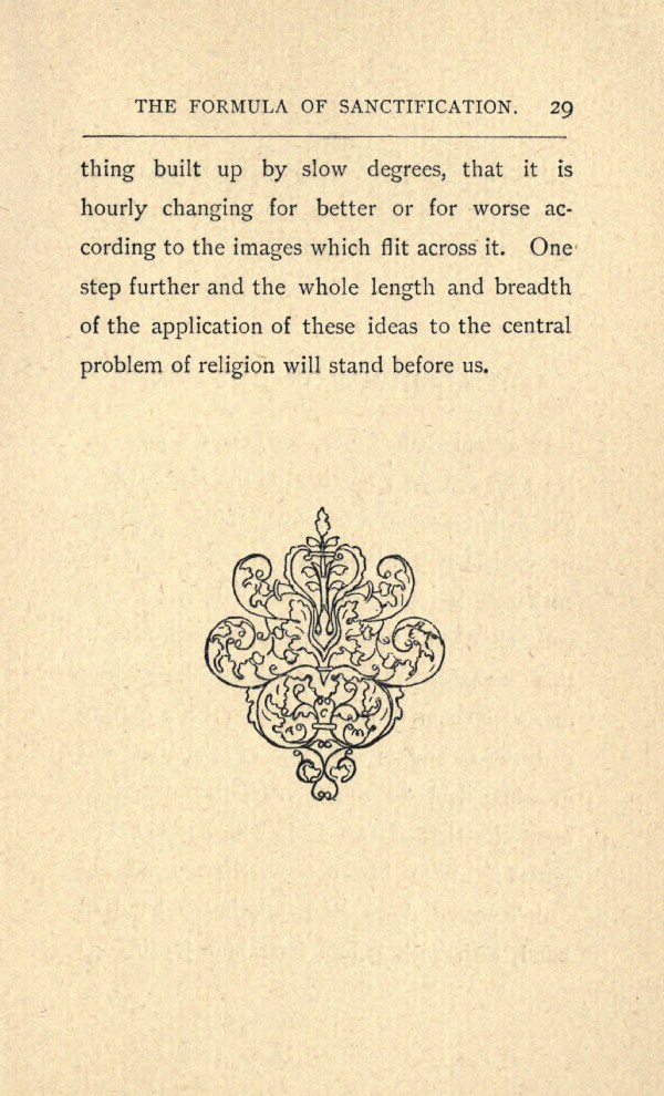 thing built up by slow degrees, that it is hourly changing for better or for worse according to the images which flit across it. One step further and the whole length and breadth of the application of these ideas to the central problem of religion will stand before us.