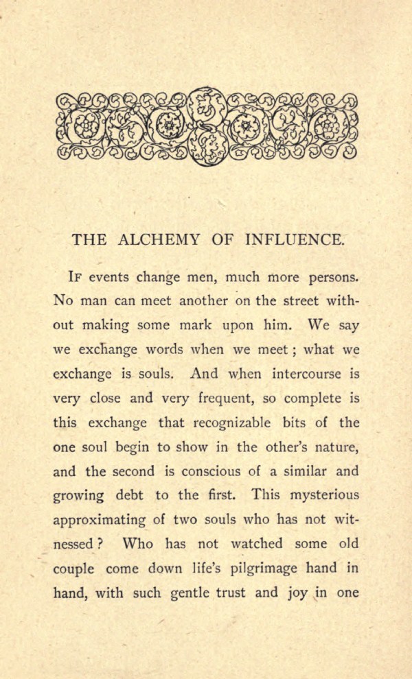 If events change men, much more persons. No man can meet another on the street without making some mark upon him. We say we exchange words when we meet; what we exchange is souls. And when intercourse is very close and very frequent, so complete is this exchange that recognizable bits of the one soul begin to show in the other's nature, and the second is conscious of a similar and growing debt to the first. This mysterious approximating of two souls who has not witnessed? Who has not watched some old couple come down life's pilgrimage hand in hand, with such gentle trust and joy in one