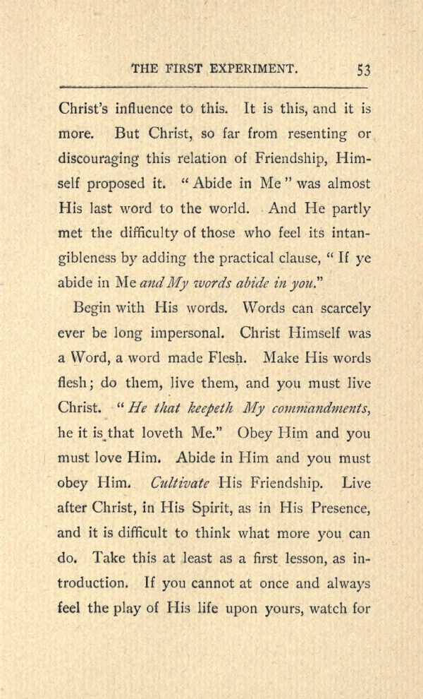 Christ's influence to this. It is this, and it is more. But Christ, so far from resenting or discouraging this relation of Friendship, Himself proposed it. "Abide in Me" was almost His last word to the world. And He partly met the difficulty of those who feel its intangibleness by adding the practical clause, "If ye abide in Me and My words abide in you."