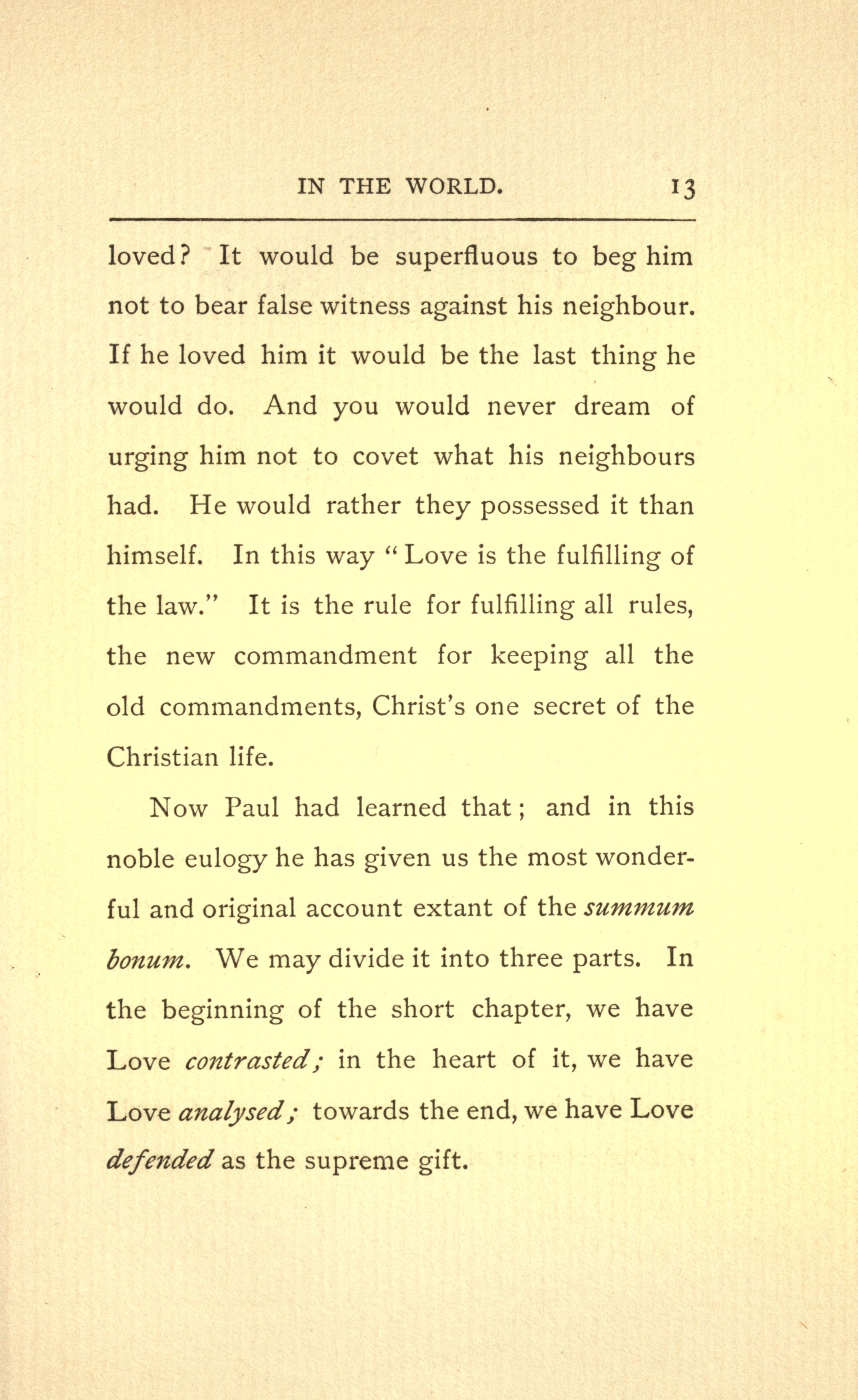 Now Paul had learned that and in this noble eulogy he has given us the most wonderful and original account extant of the summurn bonum. We may divide it into three parts. In the beginning of the short chapter, we have Love contrasted; in the heart of it, we have Love analysed; towards the end, we have Love defended as the supreme gift.