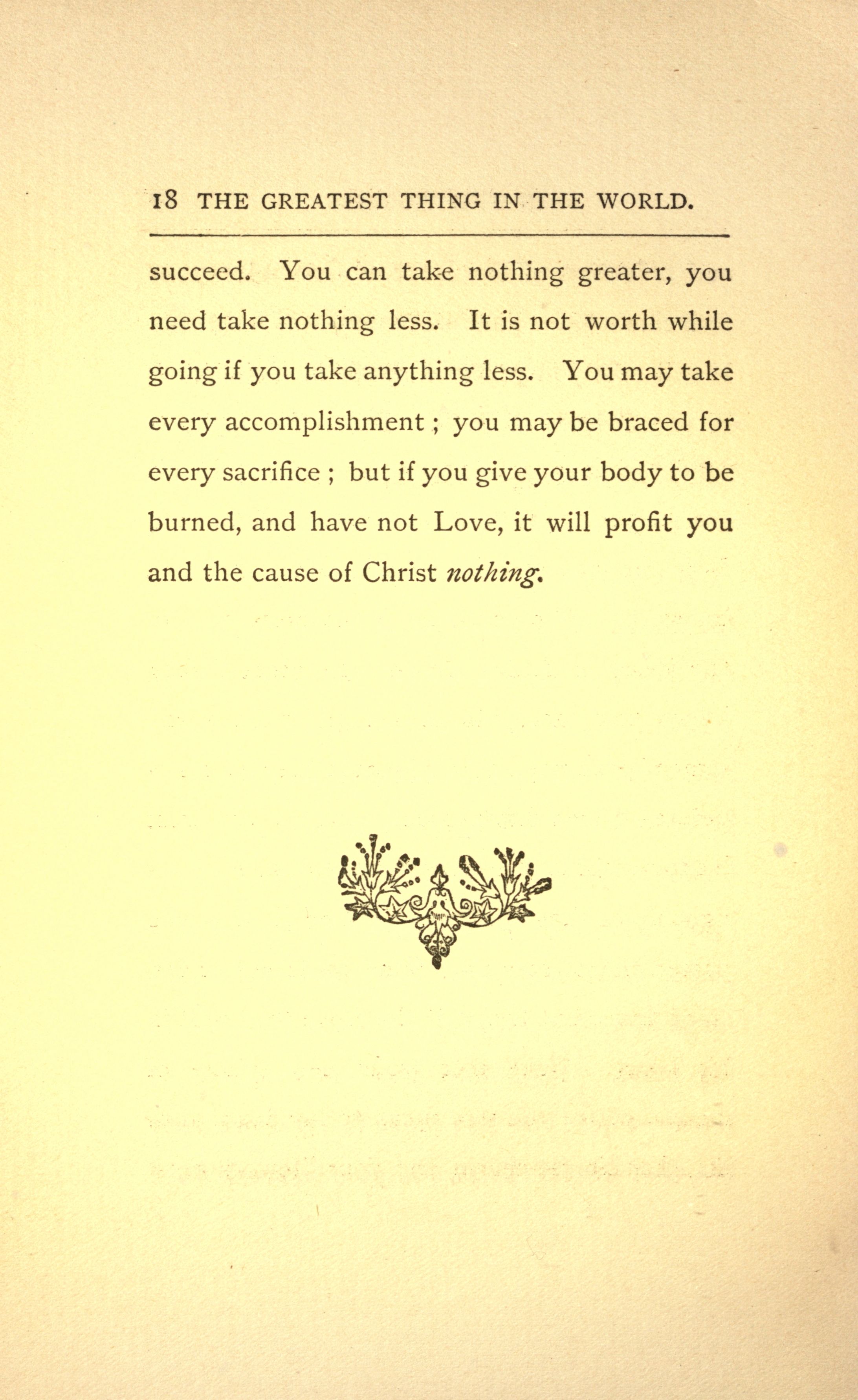 succeed. You can take nothing greater, you need take nothing less. It is not worth while going if you take anything less. You may take every accomplishment; you may be braced for every sacrifice; but if you give your body to be burned, and have not Love, it will profit you and the cause of Christ nothing.