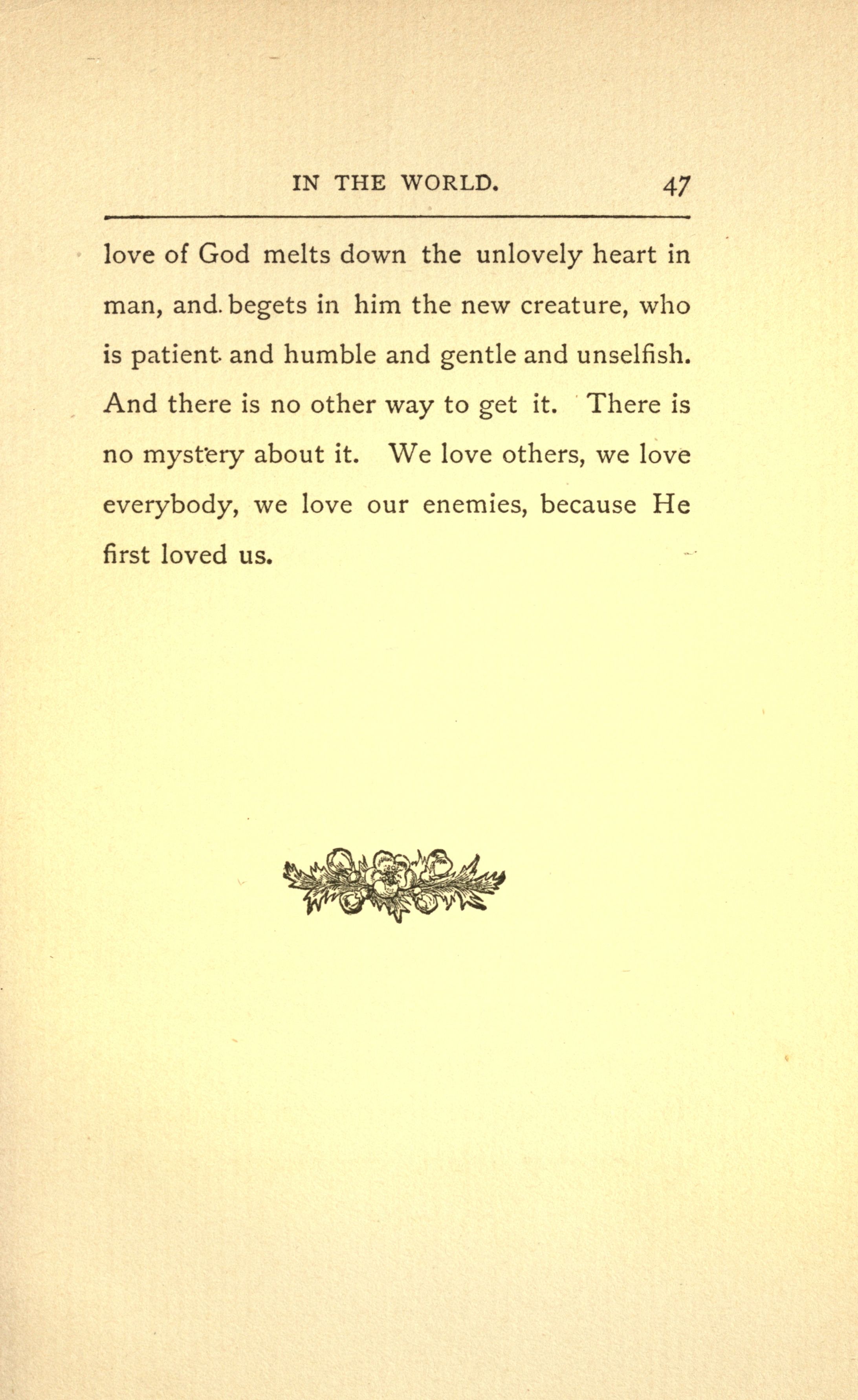 love of God melts down the unlovely heart in man, and. begets in him the new creature, who is patient. and humble and gentle and unselfish. And there is no other way to get it. There is no mystery about it. We love others, we love everybody, we love our enemies, because He first loved us.