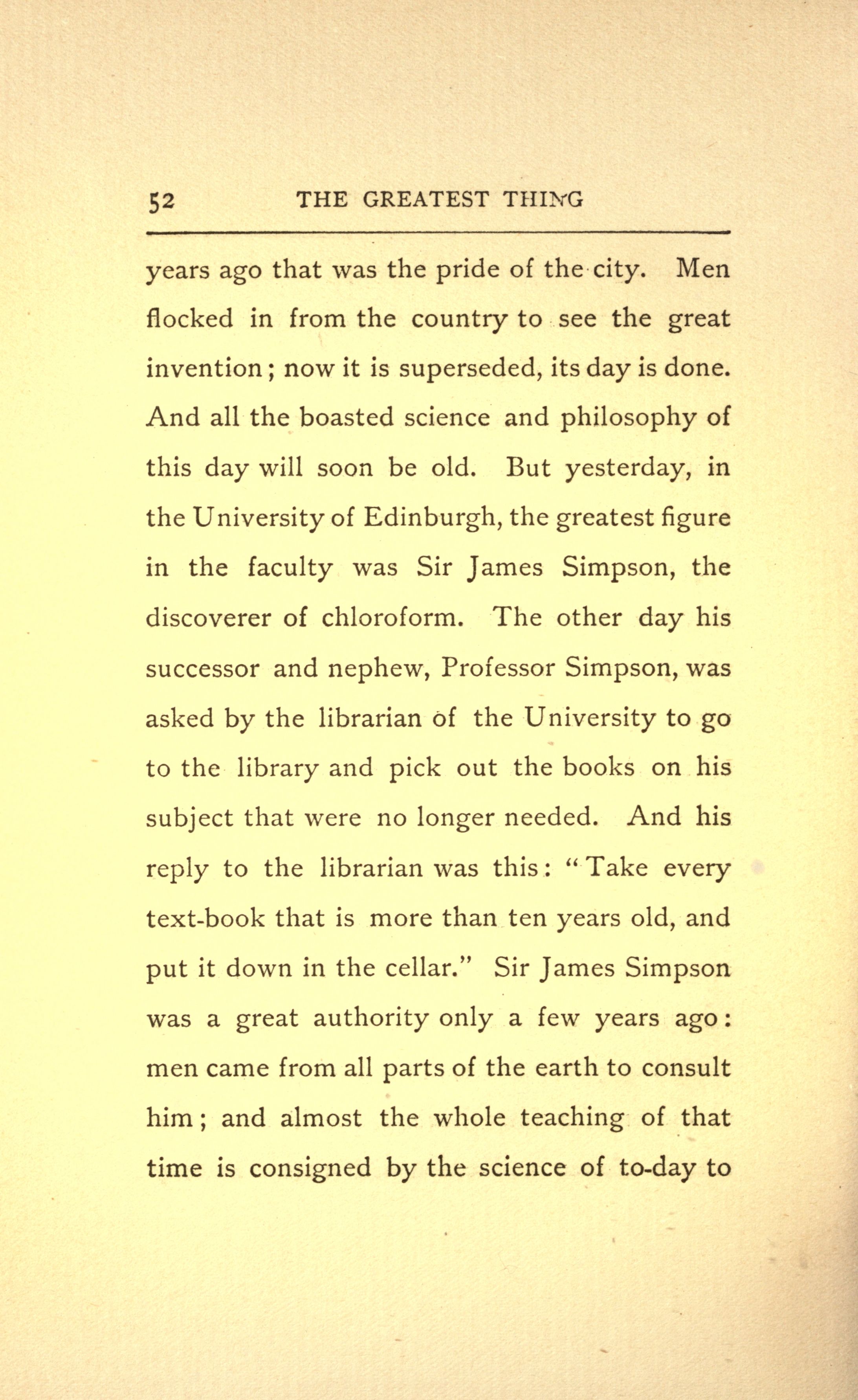 years ago that was the pride of the city. Men flocked in from the country to see the great invention; now it is superseded, its day is done. And all the boasted science and philosophy of this day will soon be old. But yesterday, in the University of Edinburgh, the greatest figure in the faculty was Sir James Simpson, the discoverer of chloroform. The other day his successor and nephew, Professor Simpson, was asked by the librarian of the University to go to the library and pick out the books on his subject that were no longer needed. And his reply to the librarian was this: "Take every text-book that is more than ten years old, and put it down in the cellar." Sir James Simpson was a great authority only a few years ago: men came from all parts of the earth to consult him; and almost the whole teaching of that time is consigned by the science of to-day to