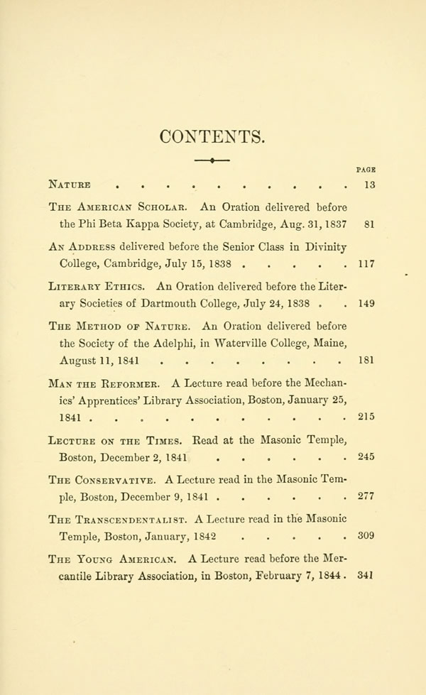 Introduction - Nature - Commodity - Beauty - Language - Discipline - Idealism - Spirit - Prospects - The American Scholar - Divinity College, Cambridge - Literary Ethics - The Method of Nature - Man the Reformer - Lecture on the Times - The Transcendentalist - The Young American - Contents -