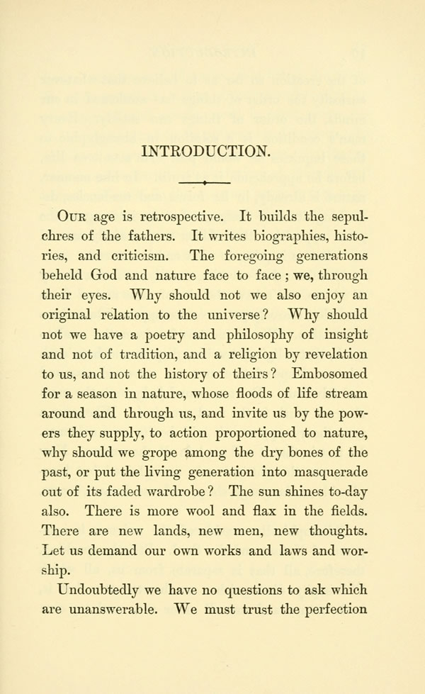 OUR age is retrospective. It builds the sepulchres of the fathers. It writes biographies, histories, and criticism. The foregoing generations beheld God and nature face to face; we, through their eyes. Why should not we also enjoy an original relation to the universe? Why should not we have a poetry and philosophy of insight and not of tradition, and a religion by revelation to us, and not the history of theirs? Embosomed for a season in nature, whose floods of life stream around and through us, and invite us by the powers they supply, to action proportioned to nature, why should we grope among the dry bones of the past, or put the living generation into masquerade out of its faded wardrobe? The sun shines to-day also. There is more wool and flax in the fields. There are new lands, new men, new thoughts. Let us demand our own works and laws and worship.