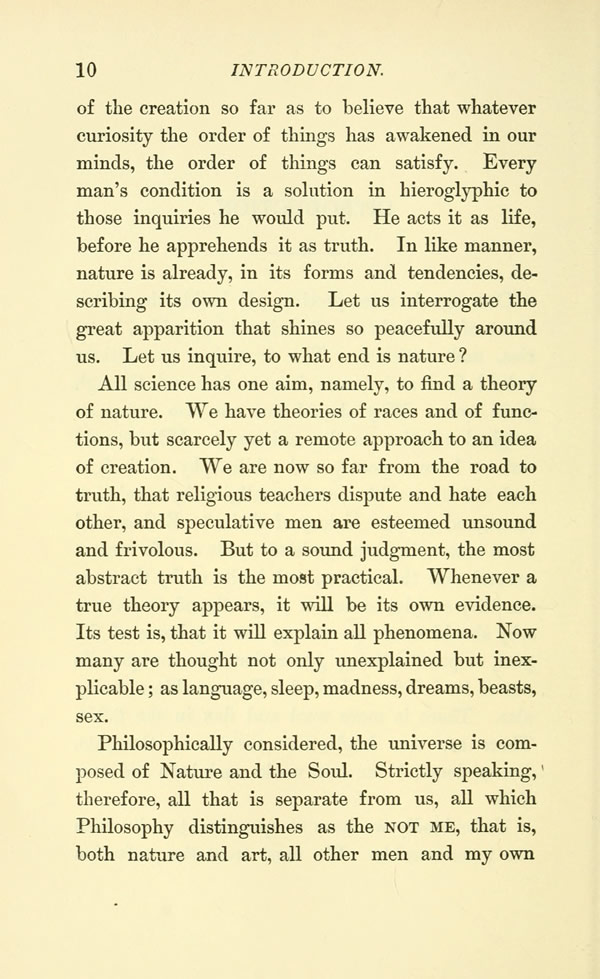 All science has one aim, namely, to find a theory of nature. We have theories of races and of functions, but scarcely yet a remote approach to an idea of creation. We are now so far from the road to truth, that religious teachers dispute and hate each other, and speculative men are esteemed unsound and frivolous. But to a sound judgment, the most abstract truth is the most practical. Whenever a true theory appears, it will be its own evidence. Its test is, that it will explain all phenomena. Now many are thought not only unexplained but inexplicable; as language, sleep, madness, dreams, beasts, sex.