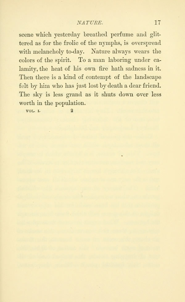 scene which yesterday breathed perfume and glittered as for the frolic of the nymphs, is overspread with melancholy to-day. Nature always wears the colors of the spirit. To a man laboring under calamity, the heat of his own fire bath sadness in it. Then there is a kind of contempt of the landscape felt by him who has just lost by death a clear friend.