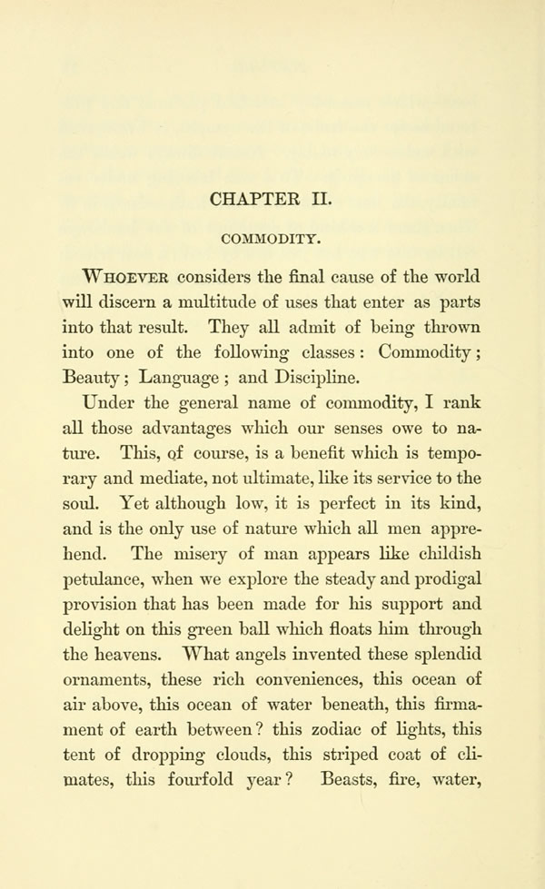 WHOEVER considers the final cause of the world will discern a multitude of uses that enter as parts into that result. They all admit of being thrown into one of the following classes: Commodity; Beauty; Language; and Discipline.