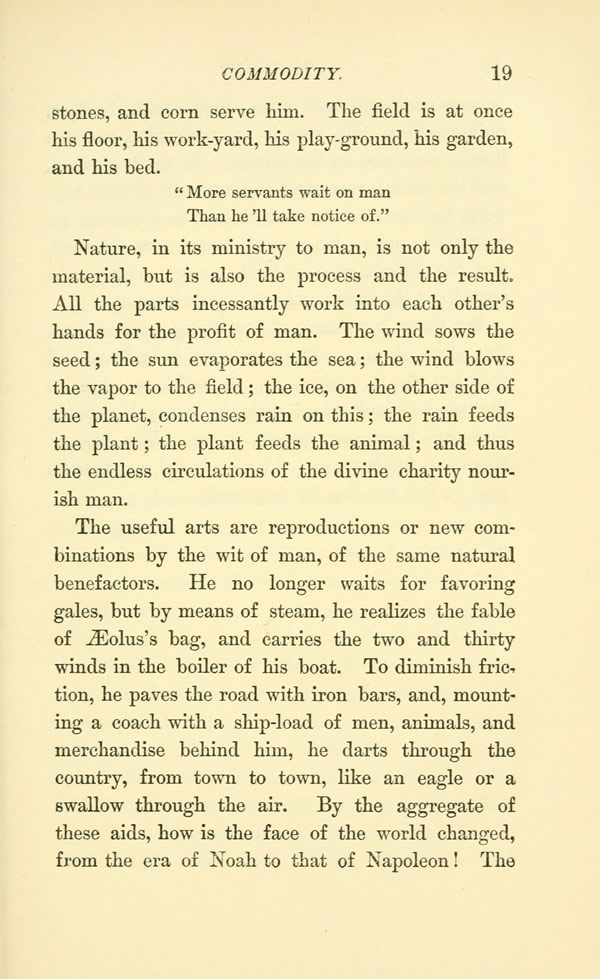 The useful arts are reproductions or new combinations by the wit of man, of the same natural benefactors. He no longer waits for favoring gales, but by means of steam, he realizes the fable of AEolus's bag, and carries the two and thirty winds in the boiler of his boat. To diminish friction, he paves the road with iron bars, and, mounting a coach with a ship-load of men, animals, and merchandise behind him, he darts through the country, from town to town, like an eagle or a swallow through the air. By the aggregate of these aids, how is the face of the world changed, from the era of Noah to that of Napoleon' The