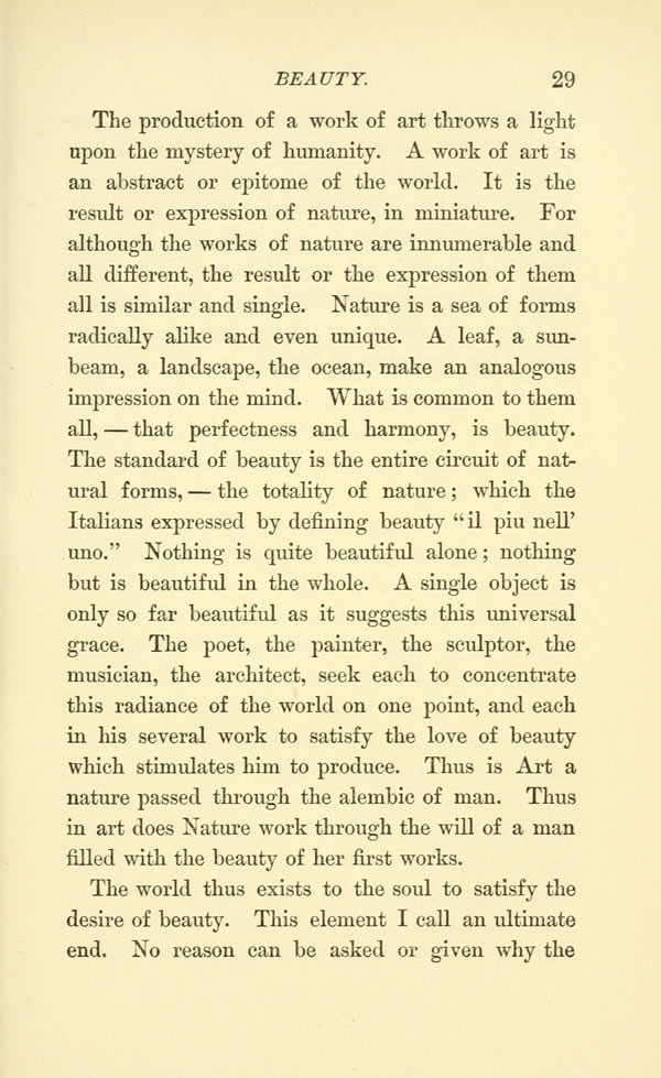 The standard of beauty is the entire circuit of natural forms, --- the totality of nature; which the Italians expressed by defining beauty "il piu nell' uno." Nothing is quite beautiful alone; nothing but is beautiful in the whole. A single object is only so far beautiful as it suggests this universal grace. The poet, the painter, the sculptor, the musician, the architect, seek each to concentrate this radiance of the world on one point, and each in his several work to satisfy the love of beauty which stimulates him to produce. Thus is Art a nature passed through the alembic of man. Thus in art does Nature work through the will of a man filled with the beauty of her first works.
