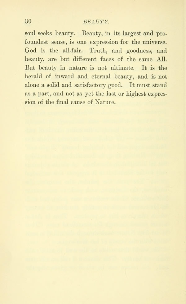 But beauty in nature is not ultimate. It is the herald of inward and eternal beauty, and is not alone a solid and satisfactory good. It must stand as a part, and not as yet the last or highest expression of the final cause of Nature.