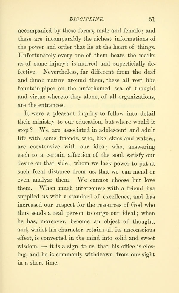 It were a pleasant inquiry to follow into detail their ministry to our education, but where would it stop? We are associated in adolescent and adult life with some friends, who, like skies and waters, are coextensive with our idea; who, answering each to a certain affection of the soul, satisfy our desire on that side; whom we lack power to put at such focal distance from us, that we can mend or even analyze them. We cannot choose but love them. When much intercourse with a friend has supplied us with a standard of excellence, and has increased our respect for the resources of God who thus sends a real person to outgo our ideal; when he has, moreover, become an object of thought, and, whilst his character retains all its unconscious effect, is converted in the mind into solid and sweet wisdom, --- it is a sign to us that his office is closing, and he is commonly withdrawn from our sight in a short time.