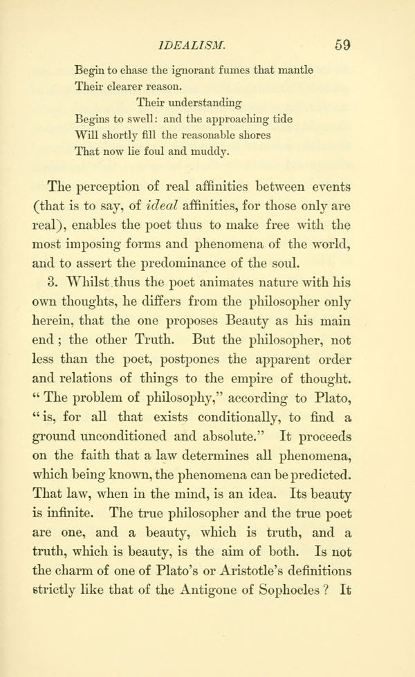 3. Whilst thus the poet animates nature with his own thoughts, he differs from the philosopher only herein, that the one proposes Beauty as his main end; the other Truth. But the philosopher, not less than the poet, postpones the apparent order and relations of things to the empire of thought. The problem of philosophy,"according to Plato," is, for all that exists conditionally, to find a ground unconditioned and absolute." It proceeds on the faith that a law determines all phenomena, which being known, the phenomena can be predicted. That law, when in the mind, is an idea. Its beauty is infinite. The true philosopher and the true poet are one, and a beauty, which is truth, and a truth, which is beauty, is the aim of both. Is not the charm of one of Plato's or Aristotle's definitions strictly like that of the Antigone of Sophocles? It