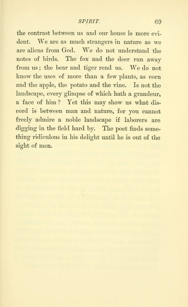 the contrast between us and our house is more evident. We are as much strangers in nature as we are aliens from God. We do not understand the notes of birds. The fox and the deer run away from us; the bear and tiger rend us. We do not know the uses of more than a few plants, as corn and the apple, the potato and the vine. Is not the landscape, every glimpse of which bath a grandeur, a face of him? Yet this may show us what discord is between man and nature, for you cannot freely admire a noble landscape if laborers are digging in the field hard by. The poet finds something ridiculous in his delight until he is out of the sight of men.