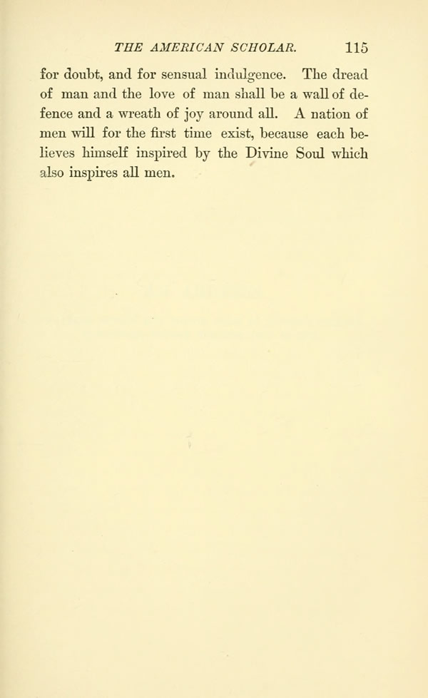 for doubt, and for sensual indulgence. The dread of man and the love of man shall be a wall of defence and a wreath of joy around all. A nation of men will for the first time exist, because each believes himself inspired by the Divine Soul which also inspires all men.