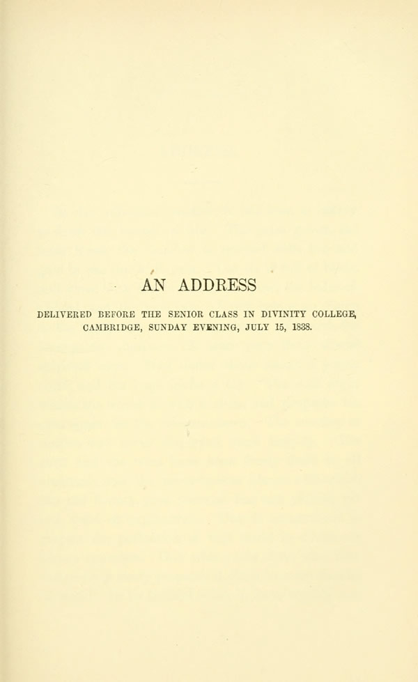 Introduction - Nature - Commodity - Beauty - Language - Discipline - Idealism - Spirit - Prospects - The American Scholar - Divinity College, Cambridge - Literary Ethics - The Method of Nature - Man the Reformer - Lecture on the Times - The Transcendentalist - The Young American - Contents -