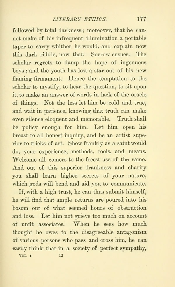 followed by total darkness; moreover, that he cannot make of his infrequent illumination a portable taper to carry whither he would, and explain now this dark riddle, now that. Sorrow ensues. The scholar regrets to damp the hope of ingenuous boys; and the youth has lost a star out of his new flaming firmament. Hence the temptation to the scholar to mystify, to hear the question, to sit upon it, to make an answer of words in lack of the oracle of things. Not the less let him be cold and true, and wait in patience, knowing that truth can make even silence eloquent and memorable. Truth shall be policy enough for him. Let him open his breast to all honest inquiry, and be an artist superior to tricks of art. Show frankly as a saint would do, your experience, methods, tools, and means.