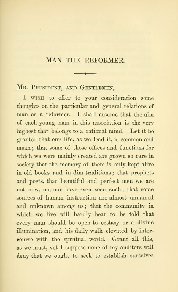 I WISH to offer to your consideration some thoughts on the particular and general relations of man as a reformer. I shall assume that the aim of each young man in this association is the very highest that belongs to a rational mind. Let it be granted that our life, as we lead it, is common and mean; that some of those offices and functions for which we were mainly created are grown so rare in society that the memory of them is only kept alive in old books and in dim traditions; that prophets and poets, that beautiful and perfect men we are not now, no, nor have even seen such; that some sources of human instruction are almost unnamed and unknown among us; that the community in which we live will hardly bear to be told that every man should be open to ecstasy or a divine illumination, and his daily walk elevated by intercourse with the spiritual world. Grant all this, as we must, yet I suppose none of my auditors will deny that we ought to seek to establish ourselves