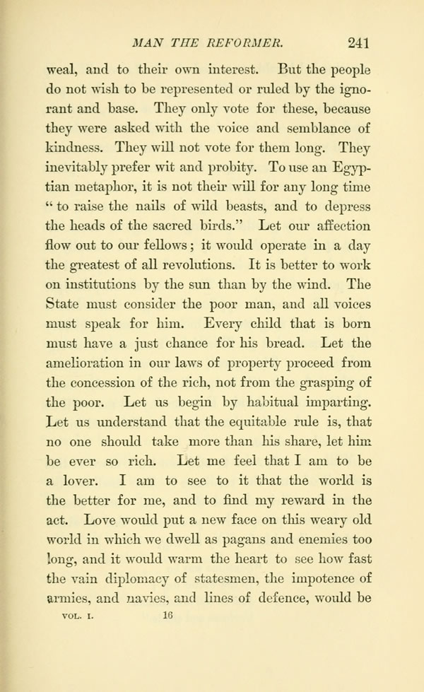 weal, and to their own interest. But the people do not wish to be represented or ruled by the ignorant and base. They only vote for these, because they were asked with the voice and semblance of kindness. They will not vote for them long. They inevitably prefer wit and probity. To use an Egyptian metaphor, it is not their will for any long time " to raise the nails of wild beasts, and to depress the heads of the sacred birds." Let our affection flow out to our fellows; it would operate in a day the greatest of all revolutions. It is better to work on institutions by the sun than by the wind. The State must consider the poor man, and all voices must speak for him. Every child that is born must have a just chance for his bread. Let the amelioration in our laws of property proceed from the concession of the rich, not from the grasping of the poor. Let us begin by habitual imparting. Let us understand that the equitable rule is, that no one should take more than his share, let him be ever so rich. Let me feel that I am to be a lover. I am to see to it that the world is the better for me, and to find my reward in the act. Love would put a new face on this weary old world in which we dwell as pagans and enemies too long, and it would warm the heart to see how fast the vain diplomacy of statesmen, the impotence of armies, and navies, and lines of defence, would be