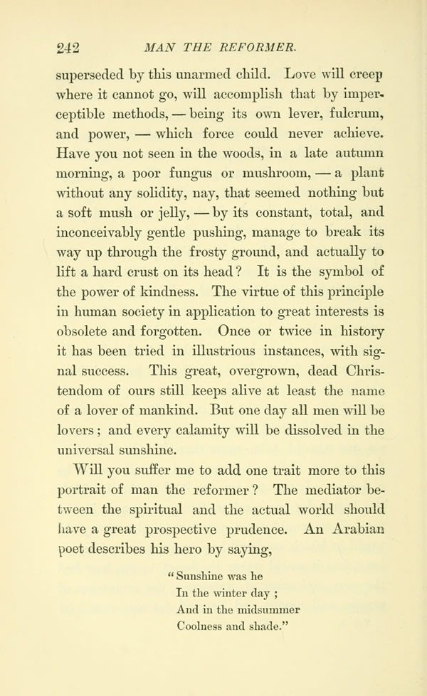 superseded by this unarmed child. Love will creep where it cannot go, will accomplish that by imperceptible methods, --- being its own lever, fulcrum, and power, --- which force could never achieve. Have you not seen in the woods, in a late autumn morning, a poor fungus or mushroom, --- a plant without any solidity, nay, that seemed nothing but a soft mush or jelly, --- by its constant, total, and inconceivably gentle pushing, manage to break its way up through the frosty ground, and actually to lift a hard crust on its head? It is the symbol of the power of kindness. The virtue of this principle in human society in application to great interests is obsolete and forgotten. Once or twice in history it has been tried in illustrious instances, with signal success. This great, overgrown, dead Christendom of ours still keeps alive at least the name of a lover of mankind. But one day all men will be lovers; and every calamity will be dissolved in the universal sunshine.