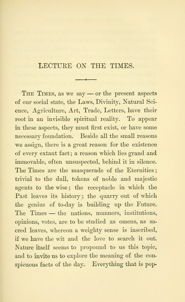 TIIE TIMES, as we say --- or the present aspects of our social state, the Laws, Divinity, Natural Science, Agriculture, Art, Trade, Letters, have their root in an invisible spiritual reality. To appear in these aspects, they must first exist, or have some necessary foundation. Beside all the small reasons we assign, there is a great reason for the existence of every extant fact; a reason which lies grand and immovable, often unsuspected, behind it in silence. The Times are the masquerade of the Eternities; trivial to the dull, tokens of noble and majestic agents to the wise; the receptacle in which the Past leaves its history; the quarry out of which the genius of to-day is building up the Future. The Times --- the nations, manners, institutions, opinions, votes, are to be studied as omens, as sacred leaves, whereon a weighty sense is inscribed, if we have the wit and the love to search it out. Nature itself seems to propound to us this topic, and to invite us to explore the meaning of the conspicuous facts of the day. Everything that is popular,