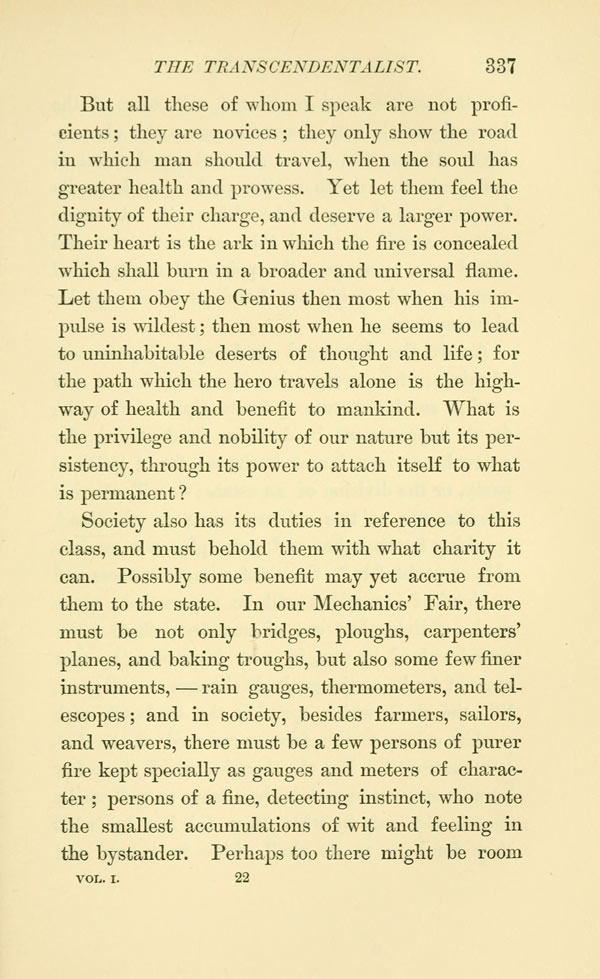 Society also has its duties in reference to this class, and must behold them with what charity it can. Possibly some benefit may yet accrue from them to the state. In our Mechanics' Fair, there must be not only bridges, ploughs, carpenters' planes, and baking troughs, but also some few finer instruments, --- rain gauges, thermometers, and telescopes; and in society, besides farmers, sailors, and weavers, there must be a few persons of purer fire kept specially as gauges and meters of character; persons of a fine, detecting instinct, who note the smallest accumulations of wit and feeling in the bystander. Perhaps too there might be room