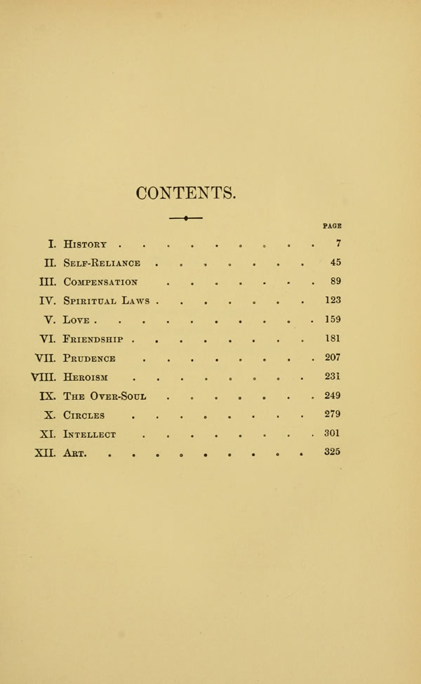Contents - History - Self-Reliance - Compensation - Spritual Laws - Love - Friendship - Prudence - Heroism - The Over-Soul - Circles - Intellect - Art